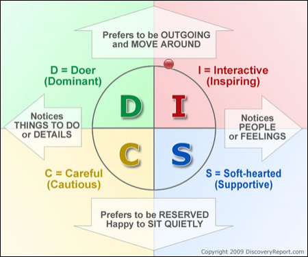 A diagram of the DISC personality model of human behavior is shown below. There are four main personality styles: D, I, S and C which are each represented as a quadrant in a circle. The four arrows in the diagram represent a person's preferences or orientation. Everyone has a combination of all four personality traits to a greater or lesser degree. Mary's personality blend appears on the chart below as a red circle.